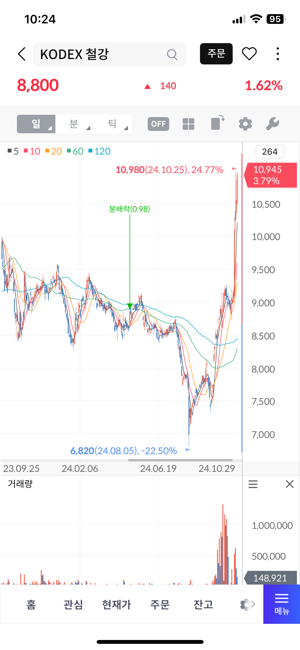 주알못인 나는 한때 철강이 괜찮다고 어케 주워들어서 21년 5월쯤 철강 주식을 10870원에 샀다. 이놈의 주식은 내가 사면 어디서 알았는지 귀신같이 하락을 진행시키는데 주르륵 미끄러지고 만다.ㅠㅠ 그후로 24년까지 이따금씩 구조대가 구하러왔지만 10870원 근처엔 못오고 떠났다. 그러던 어느날 우연히 본 장봉 11000원이 떴고 수익이고 뭐고 그냥 전량 매도를 걸었다.평소 나같았으면 어 이러다 20000원 되는거아냐? 하면서 수년간의 고통을 잊은채 불탈준비를 했을지 모르겠지만 이날은 길가다 멈추고 전량 매도를 부리나케 걸었다.그러고 갈길이 바빠 체결여부는 못보고 나중에 봤는데다음날 현재가를 보니...아니나 다를까 파란 기둥 ㅠㅠ겨우겨우 우연히 봐서 다행히 팔렸고.. 제비용 총수익 0.2%로 kodex ..